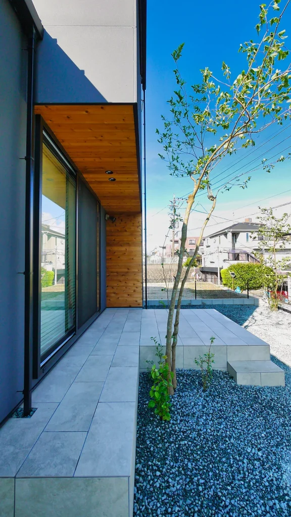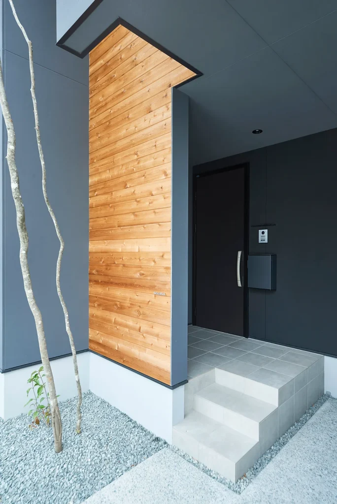 玄関前には、ハーフガレージで雨にぬれずに外出を